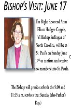 NEW PHOTO DIRETORY: If you have not had your picture taken yet for the new picture directory would like to participate, go to the www.stpaulscary.org and click on the link to sign up. Dates are June 13-16. Please contact Jill Cole at jillco0405@gmail.com if you have questions.