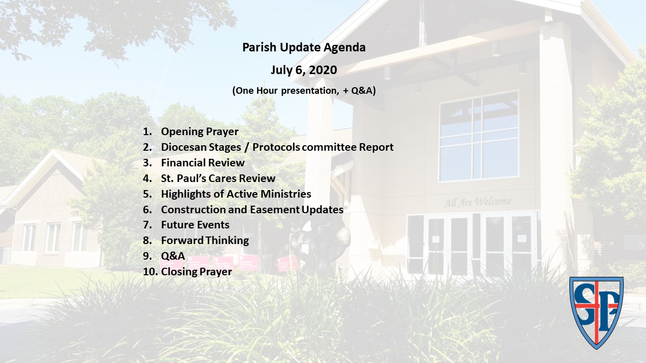 A Parish Update in Zoom Webinar format was presented on Monday, July 6, 2020 at 7:00 p.m. The panel of Rector George Adamik, Treasurer John Goehrke, Senior Warden Mary Kintz and Junior Warden Frank Laney presented information about how we are moving forward as a faith community in the midst of the pandemic. A recording of the Webinar is available HERE. A picture of the agenda is available HERE. .