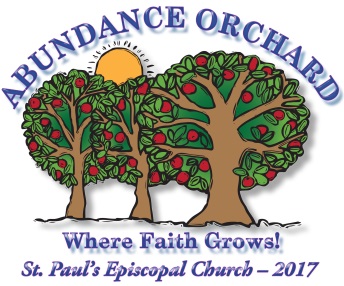 Vacation Bible School (VBS) is July 10-14, 2017 from 9:00 AM to 12:00 noon. This summer’s VBS is: Abundance Orchard: Where Faith Grows!