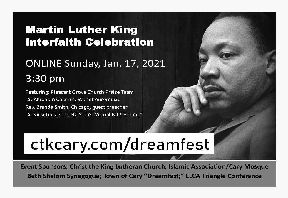 For the second year in a row, Cary congregations participating in the Cary Area Ministerial Alliance (CAMA) will co-host the interfaith prayer service that is part of the Town of Cary’s “Dreamfest” during the weekend of Martin Luther King Day. Set for Sunday, January 17, at 3:30 pm, the service will originate from Christ the King Lutheran Church and will be live streamed on the church’s YouTube channel. Similarly, this year’s guest preacher, Rev. Brenda Smith, will participate from Chicago via video. Music will be provided by a small Gospel ensemble from Pleasant Grove Church of Cary and by Dr. Abraham Cáceres of Worldhousemusic. Also participating will be Dr. Vicki Gallagher with the “virtual MLK experience” which she leads at NC State. Other event sponsors are Beth Shalom Synagogue, the Islamic Association/Cary Mosque, the Town of Cary, and the Triangle Conference of the NC Lutheran Synod. The service can be viewed live on January 17 at 3:30 pm at www.ctkcary.com/dreamfest
