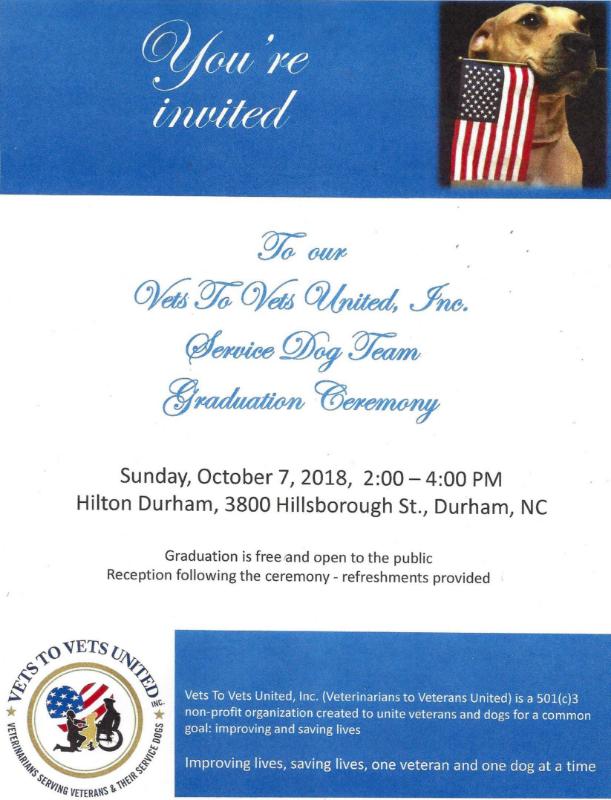 Vets to Vets United “consists of local Veterinarians and volunteers working together to provide Military Veterans suffering from various disabilities with therapeutic and emotional support animals (provided by local shelters, reducing significantly euthanized animals)” and works closely with the Durham Veteran’s Hospital in Durham, NC.