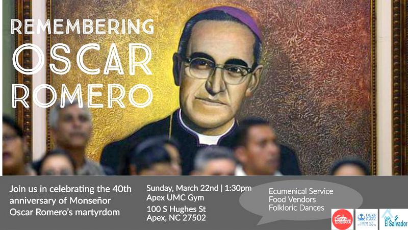 Join in commemorating the 40th anniversary of the martyrdom of Salvadoran Roman Catholic Archbishop Oscar Romero, who was assassinated while celebrating mass in a hospital chapel in 1980. Romero was canonized as a saint by Pope Francis in 2018. An ecumenical service will be held March 22, 2020 at 1:30 p.m. in the Christian Life Center of Apex United Methodist Church.